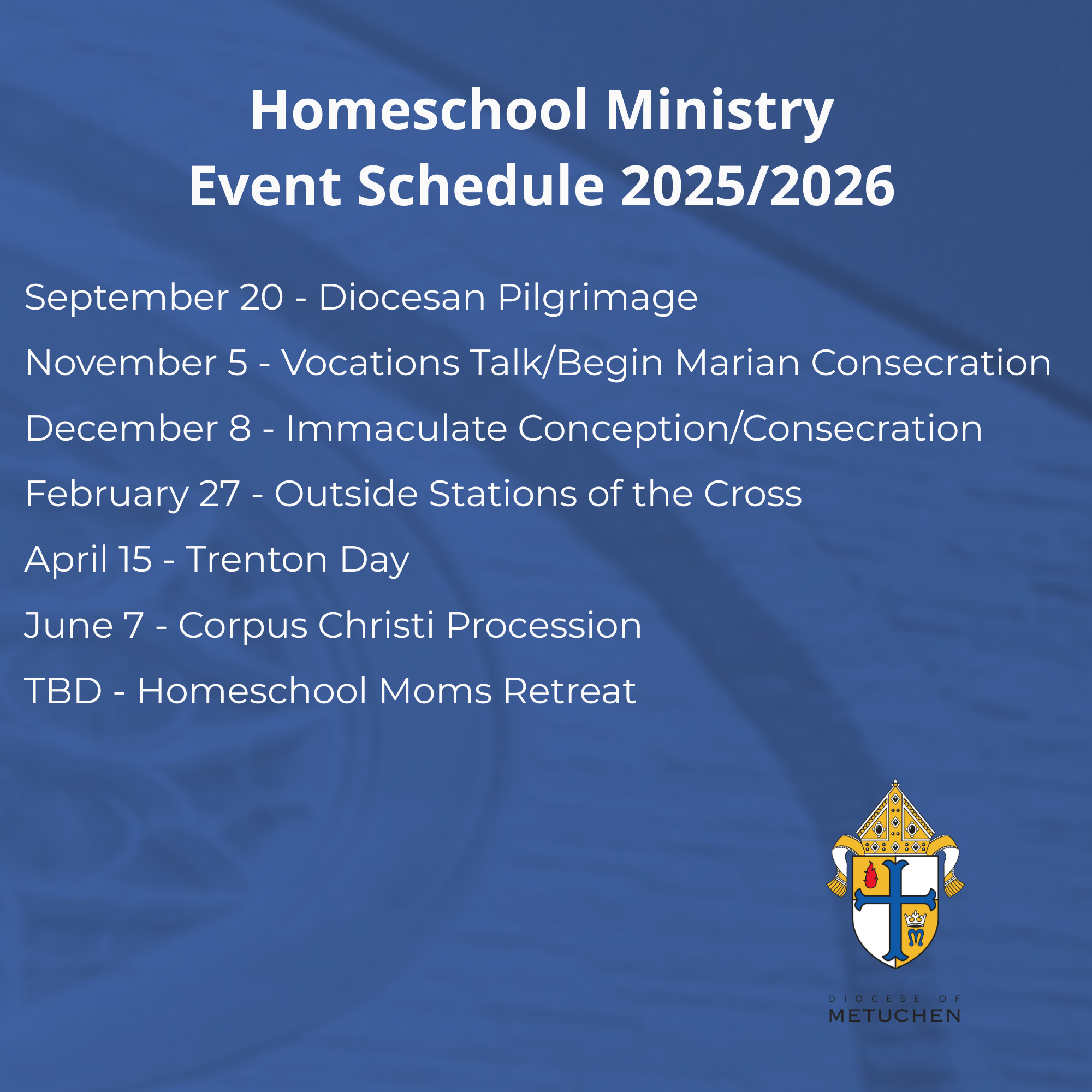 The Homeschool Ministry in the Diocese of Metuchen seeks to foster growth for homeschooled families in the areas of connection to the diocese, spirituality, discipleship, and vocational discernment.